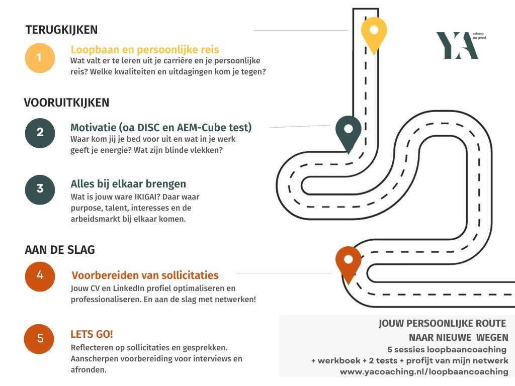 Als je het even niet meer weet help ik je vanuit bovenstaande in dit loopbaan coachingstraject. Dat kan via het wat meer vaste ‘WEG NAAR WERK’ traject of een traject op maat.